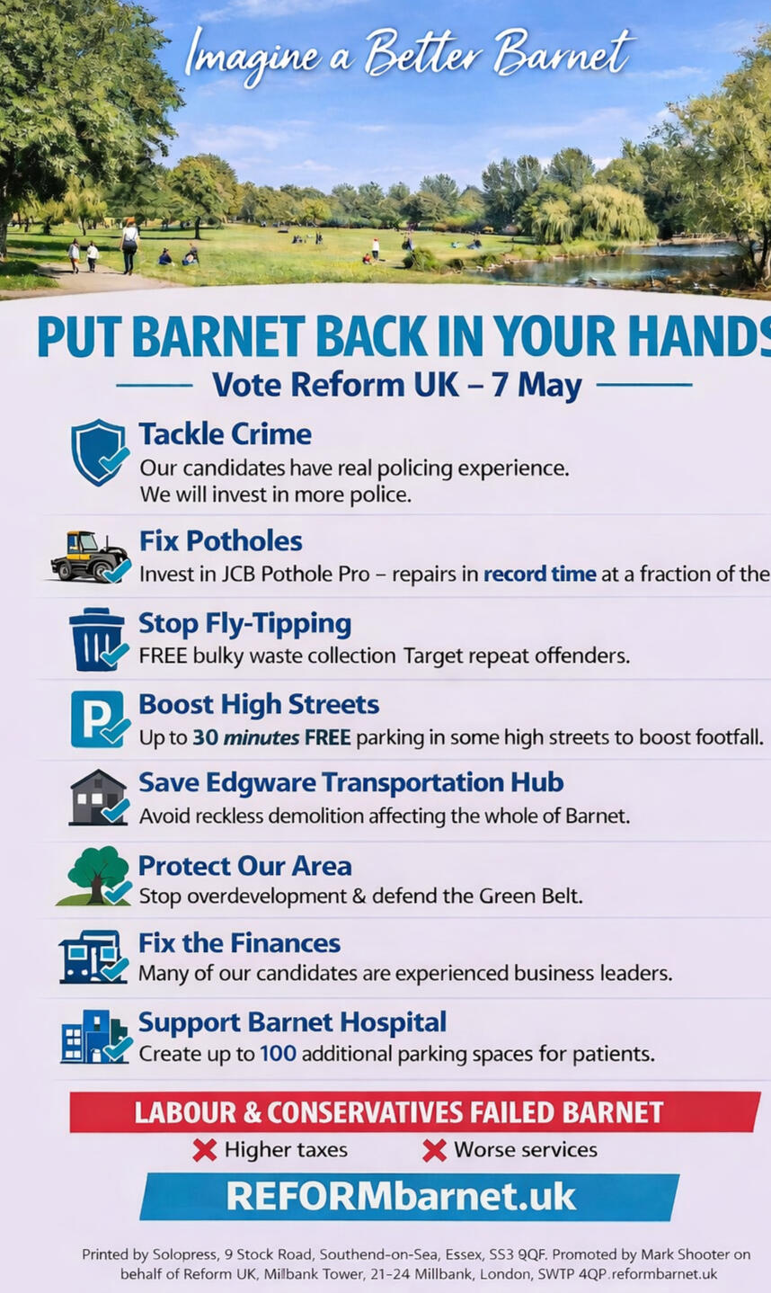 As we look ahead to the Barnet Council elections in 2026, we need local champions to carry this wave of change into every corner of our borough.Standing for council is more achievable than you might think; the minimum attendance requirement is just two meetings a year.This is a unique chance to help turn Barnet turquoise, and show the country that Reform is here to stay.